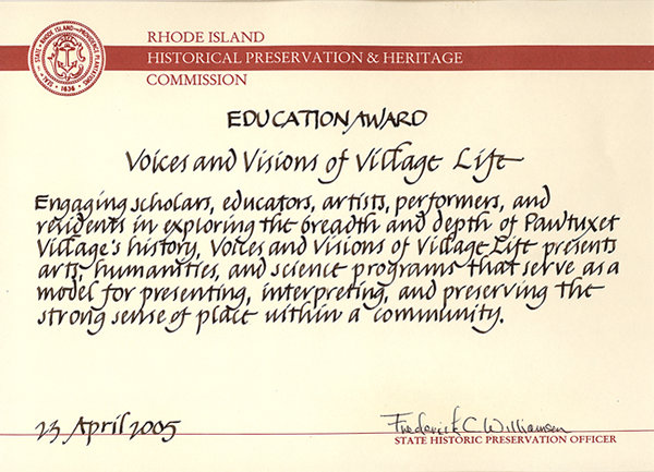 Voices and Visions of Village life received the annual Preservation Education Award for 2005 from the Rhode Island Historical Preservation and Heritage Commission. The award was presented at the 20th Annual Rhode Island Statewide Historic Preservation Conference in Newport on April 23, 2005, and signed by Frederick C. Williamson, State Historic Preservation Officer.